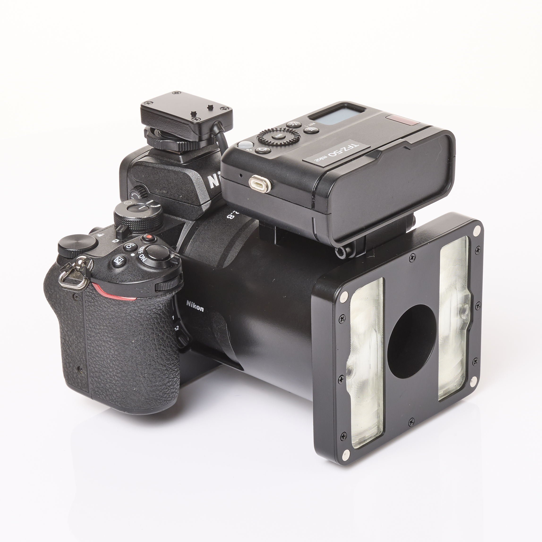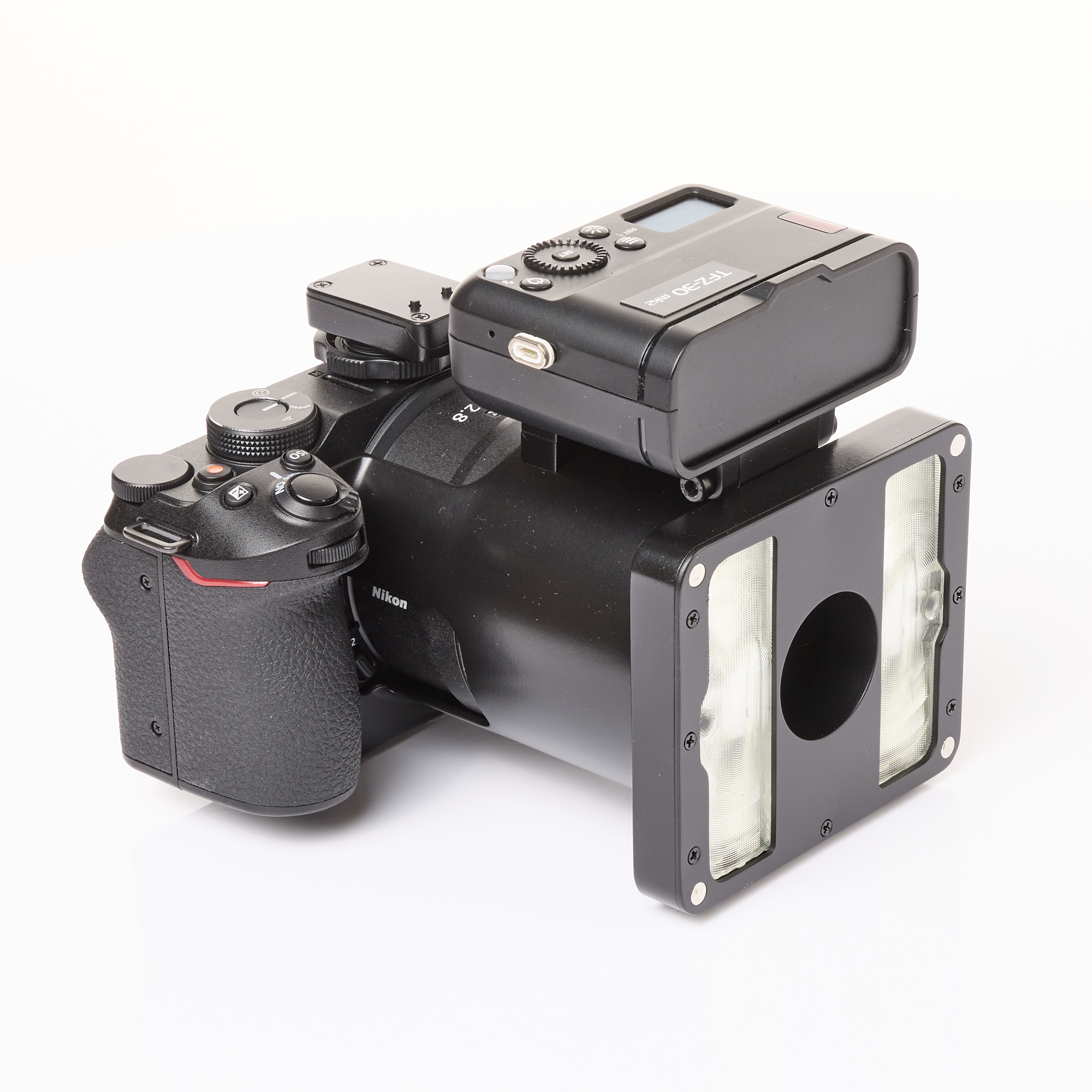 Sa lumière a été travaillée pour être parfaitement équilibrée avec l'appareil photo et son flash Canon MR14 EXII et ainsi définir parfaitement les contours des visages de vos patients.